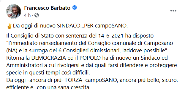 "Da oggi di nuovo SINDACO...PER campoSANO. Il Consiglio di Stato con sentenza del 14-6-2021 ha disposto "l'immediato reinsediamento del Consiglio comunale di Camposano (NA) e la surroga dei 6 Consiglieri dimissionari, laddove possibile". -Si legge nella nota- Ritorna la DEMOCRAZIA ed il POPOLO ha di nuovo un Sindaco ed Amministratori a cui rivolgersi e dai quali farsi difendere e proteggere specie in questi tempi così difficili. Da oggi -ancora di più- FORZA campoSANO, ancora più bello, sicuro, efficiente e...con una sana crescita".