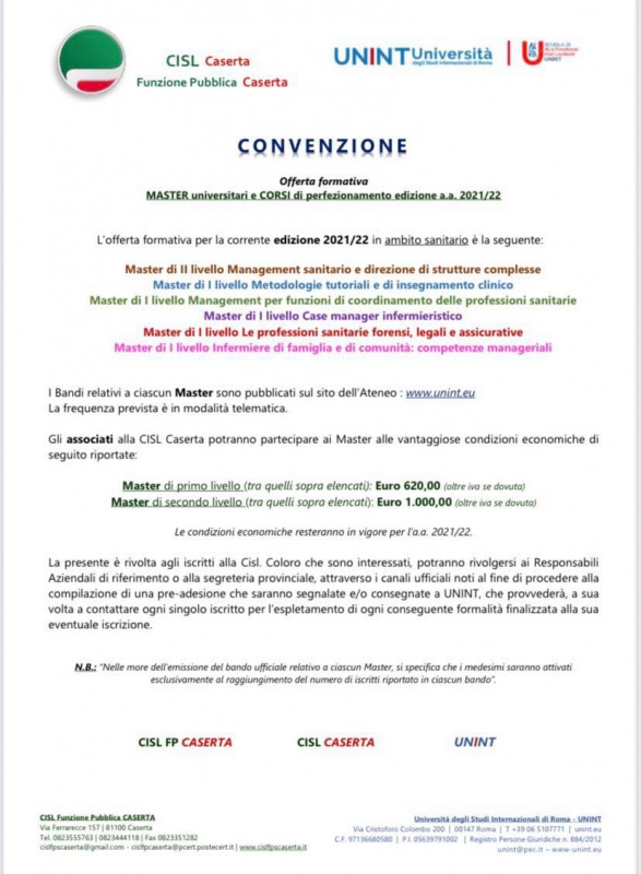 Pubblichiamo questa nota stampa:" Una ottima convenzione tra la Cisl e l'Università UNINT da far veicolare per gli iscritti che hanno in famiglia operatori sanitari. Come potete notare le rette sono di gran lunga più basse tra le varie università telematiche".