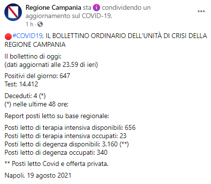 Questo il post pubblicato sulla pagina Facebook 'Regione Campania': "Covid-19, IL BOLLETTINO ORDINARIO DELL'UNITÀ DI CRISI DELLA REGIONE CAMPANIA. Il bollettino di oggi: (dati aggiornati alle 23.59 di ieri) Positivi del giorno: 647. Test: 14.412 - si legge nel post - Deceduti: 4 (*) (*) nelle ultime 48 ore; Report posti letto su base regionale: Posti letto di terapia intensiva disponibili: 656