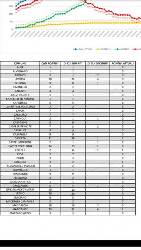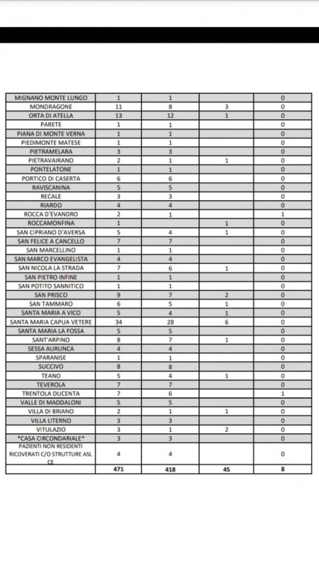 Riportiamo i dati ufficiali dei contagi da Coronavirus in provincia di Caserta pubblicati dal sito dell'Asl di Caserta: