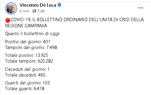 Lo apprendiamo dalla pagina Facebook del Presidente della Regione Campania, Vincenzo De Luca.