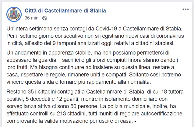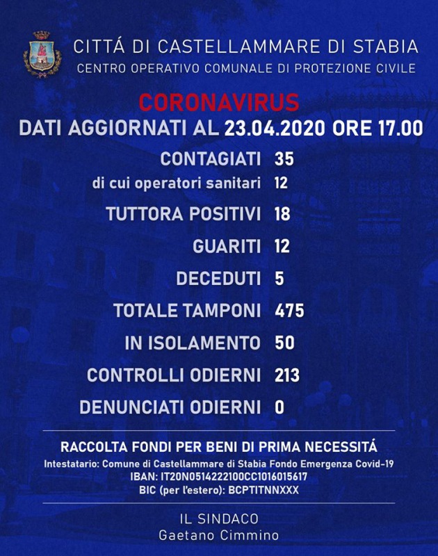 Questo quanto comunicato dal Comune di C. di Stabia
