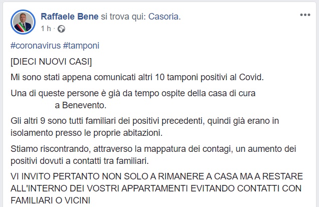 Questo quanto comunicato dal Sindaco Bene