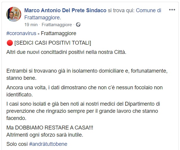 Questo quanto comunicato dal Sindaco