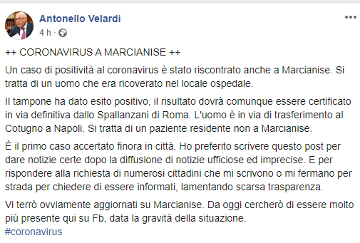 Un caso di positività al coronavirus è stato riscontrato anche a Marcianise. Si tratta di un uomo che era ricoverato nel locale ospedale. Il tampone ha dato esito positivo, il risultato dovrà comunque essere certificato in via definitiva dallo Spallanzani di Roma. L'uomo è in via di trasferimento al Cotugno a Napoli. Si tratta di un paziente residente non a Marcianise. È il primo caso accertato finora in città. Ho preferito scrivere questo post per dare notizie certe dopo la diffusione di notizie ufficiose ed imprecise. E per rispondere alla richiesta di numerosi cittadini che mi scrivono o mi fermano per strada per chiedere di essere informati, lamentando scarsa trasparenza. Vi terrò ovviamente aggiornati su Marcianise. Da oggi cercherò di essere molto più presente qui su Fb, data la gravità della situazione."