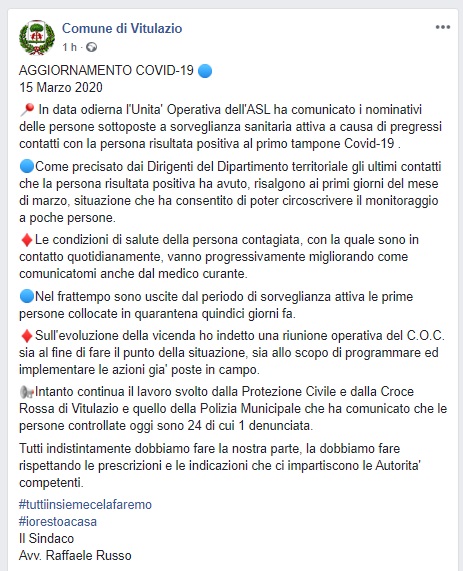 Questo quanto comunicato dalla pagina Fb del Comune di Vitulazio