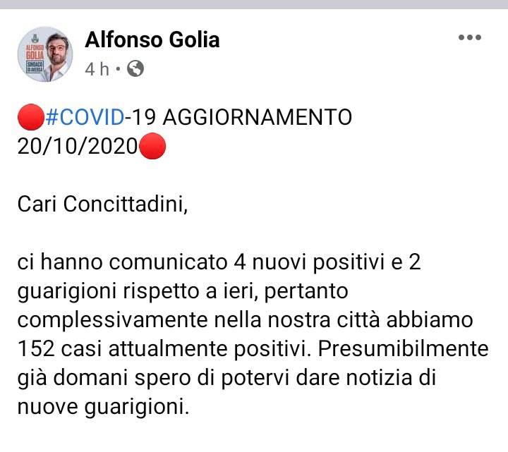 Questo quanto pubblicato sulla pagina FB del Sindaco Golia