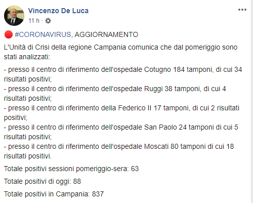 Questo il post pubblicato su Facebook dal Presidente della Regione Campania Vincenzo De Luca: