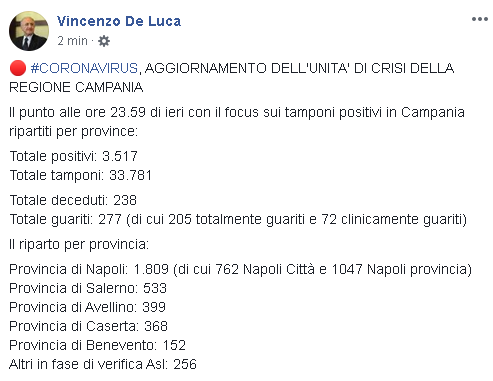 Lo apprendiamo dalla pagina Facebook del Governatore della Regione Campania, Vincenzo De Luca: