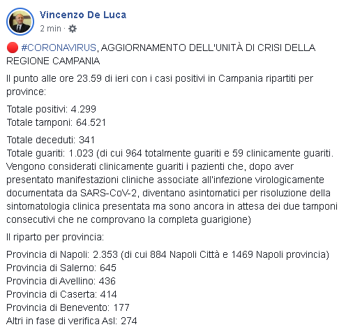 Lo apprendiamo dalla pagina Facebook del Governatore della Regione Campania, Vincenzo De Luca: