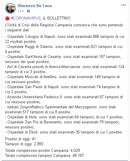 Lo apprendiamo dalla pagina Facebook del Governatore della Regione Campania, Vincenzo De Luca: