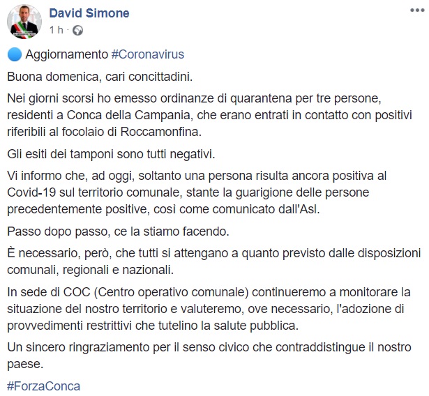 Questo quanto apprendiamo dalla pagina facebook del Sindaco Simone: