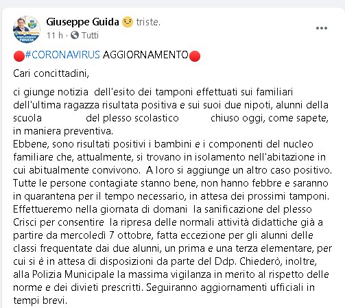 Lo apprendiamo dalla pagina Facebook del Sindaco di Arienzo, Giuseppe Guida.