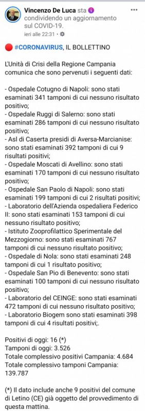 (*) Il dato include anche 9 positivi del comune di Letino (CE) già oggetto del provvedimento di questa mattina."