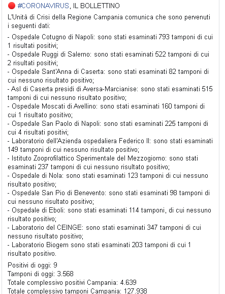 L'Unità di Crisi della Regione Campania comunica che sono pervenuti i seguenti dati: