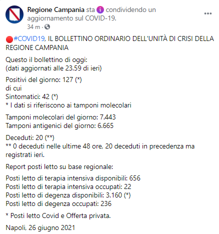 Questo il post pubblicato sulla pagina Facebook 'Regione Campania': "Covid-19, IL BOLLETTINO ORDINARIO DELL'UNITÀ DI CRISI DELLA REGIONE CAMPANIA. Questo il bollettino di oggi: (dati aggiornati alle 23.59 di ieri) Positivi del giorno: 127 (*) di cui