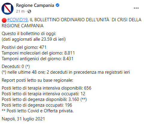 Questo il post pubblicato sulla pagina Facebook Regione Campania: "Covid-19, IL BOLLETTINO ORDINARIO DELL'UNITÀ DI CRISI DELLA REGIONE CAMPANIA. Questo il bollettino di oggi: (dati aggiornati alle 23.59 di ieri). Positivi del giorno: 471. Tamponi molecolari del giorno: 8.811 Tamponi antigenici del giorno: 8.431. Deceduti: 0 (*) (*) nelle ultime 48 ore - si legge post - 2 deceduti in precedenza ma registrati ieri Report posti letto su base regionale: Posti letto di terapia intensiva disponibili: 656. Posti letto di terapia intensiva occupati: 12 Posti letto di degenza disponibili: 3.160 (**). Posti letto - prosegue il post - di degenza occupati: 196 ** Posti letto Covid e Offerta privata".
