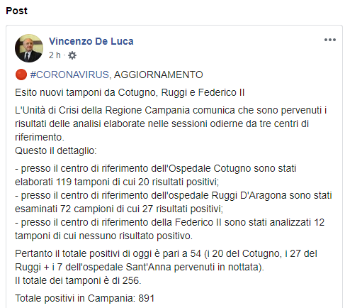 - presso il centro di riferimento della Federico II sono stati analizzati 12 tamponi di cui nessuno risultato positivo. Pertanto il totale positivi di oggi è pari a 54 (i 20 del Cotugno, i 27 del Ruggi + i 7 dell'ospedale Sant'Anna pervenuti in nottata). Il totale dei tamponi è di 256. Totale positivi in Campania: 891".