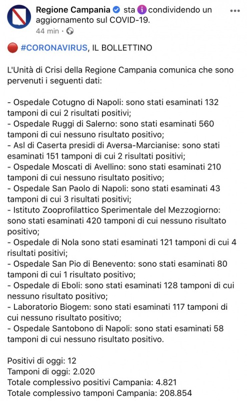 Questo quanto pubblicato dalla Regione Campania