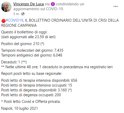 Questo il post pubblicato sulla sua pagina Facebook dal Governatore della Regione Campania Vincenzo De Luca: "Covid-19. IL BOLLETTINO ORDINARIO DELL'UNITÀ DI CRISI DELLA REGIONE CAMPANIA. Questo il bollettino di oggi: (dati aggiornati alle 23.59 di ieri) Positivi del giorno: 210 (*) Tamponi molecolari del giorno: 7.435 Tamponi - prosegue il post - antigenici del giorno: 6.048
