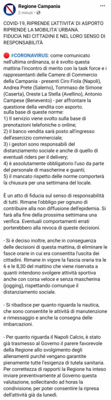 5) il mancato rispetto delle norme comporterà la chiusura per una settimana del locale. È un atto di fiducia sul senso di responsabilità di tutti. Rimane l'obbligo per ognuno di contribuire alla non diffusione dell'epidemia. Si farà alla fine della prossima settimana una verifica. Eventuali comportamenti errati porterebbero alla revoca di queste decisioni. Si è deciso inoltre, anche in conseguenza delle decisioni di questa mattina, di eliminare le fasce orarie in cui era consentita l'uscita dei cittadini. Rimane in vigore la fascia oraria tra le 6 e le 8,30 del mattino che viene riservata a quanti intendono svolgere attività sportiva anche con corsa veloce e senza mascherina (jogging), rispettando comunque il distanziamento sociale. Si ribadisce per quanto riguarda la nautica, che sono consentite le attività di manutenzione e rimessaggio e anche la consegna delle imbarcazioni. Per quanto riguarda il Napoli Calcio, è stato già trasmesso al Governo il parere favorevole della Regione allo svolgimento degli allenamenti purché vengano garantite pienamente tutte l’esigenza di tutela sanitaria. Per correttezza di rapporti la Regione ha inteso inviare preventivamente al Governo questa valutazione, sollecitando ad horas la condivisione, per poter consentire la ripresa dell'attività già da lunedì.""