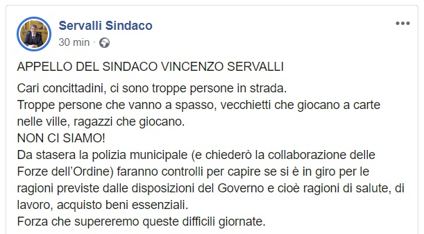 Questo quanto comunicato dal Sindaco Servalli