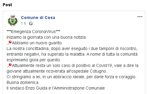 Iniziamo la giornata con una buona notizia. Abbiamo un nuovo guarito. La nostra concittadina, dopo aver eseguito i due tamponi di riscontro, entrambi negativi, ha superato la malattia. A nome di tutta la comunità esprimiamo gioia per questo. Attualmente resta un solo caso di positivo al Covid19, vale a dire la giovane attualmente ricoverata all’ospedale Cotugno. Ci stringiamo a lei, in un abbraccio ideale, per darle forza e coraggio. Buona domenica. Il sindaco Enzo Guida e l’Amministrazione Comunale"