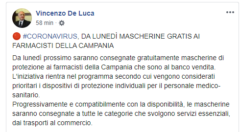 Lo apprendiamo dalla pagina Facebook del Governatore della Campania, Vincenzo De Luca: