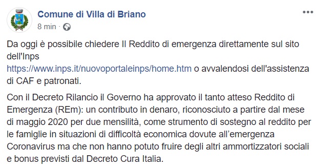 Questo quanto pubblicato sulla pagina facebook del Comune di Villa di Briano:
