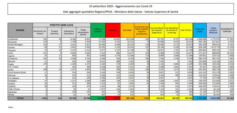 Questi i dati del Ministero della Salute: