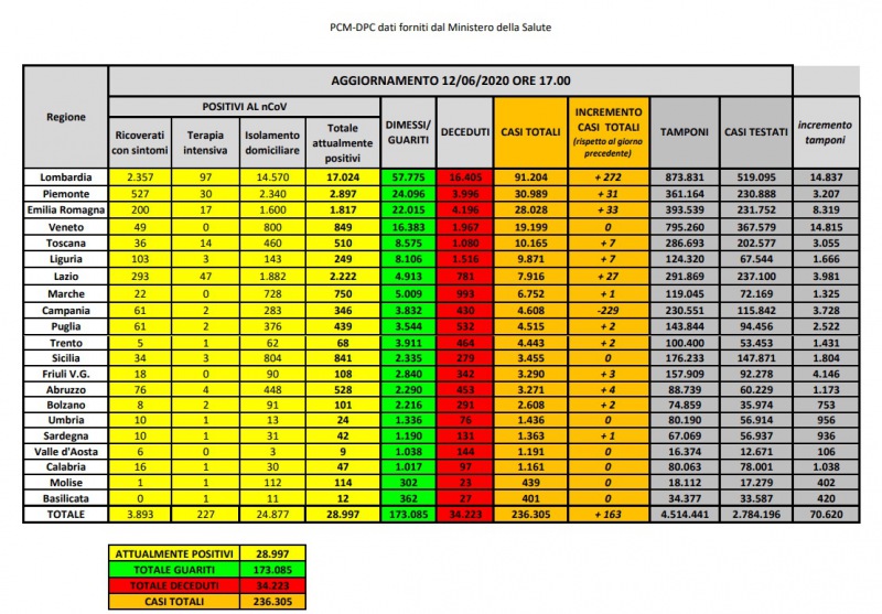 L'incremento di nuovi casi di Covid-19 è di + 163 contro +379 di ieri. È quanto si rileva dai dati del monitoraggio sanitario sulla diffusione del nuovo coronavirus diffusi alle 18 dell'12 giugno. -Si legge nella nota- Complessivamente i casi dall'inizio dell’emergenza sono 236.305, così divisi: