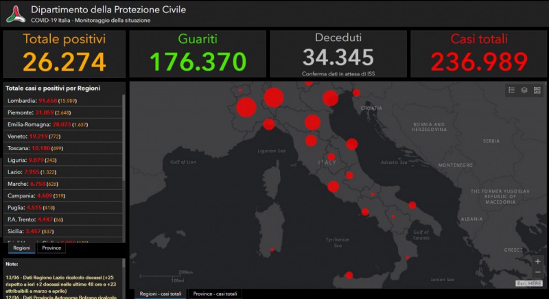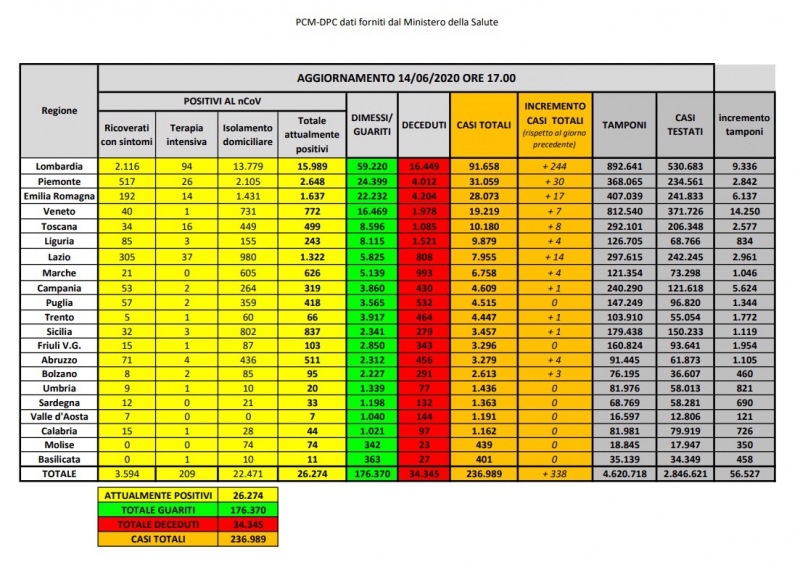 "L'incremento di nuovi casi di Covid-19 è pari a 338. In calo il trend generale dei decessi. È quanto si rileva dai dati del monitoraggio sanitario sulla diffusione del nuovo coronavirus diffusi alle 18 del 14 giugno.