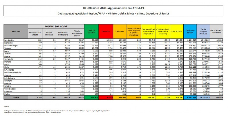 Coronavirus. Dati nazionali 18/09. In Campania salgono a 4.465 i positivi attuali