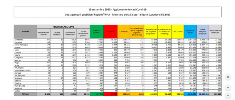 Coronavirus. Dati nazionali 19/09. In Campania salgono a 4.573 i positivi attuali