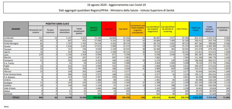 Coronavirus. Dati nazionali 19/8. In Campania salgono a 618 i positivi attuali