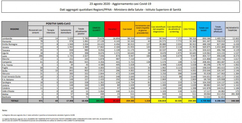 Coronavirus. Dati nazionali 23/8. In Campania salgono a 925 i positivi attuali