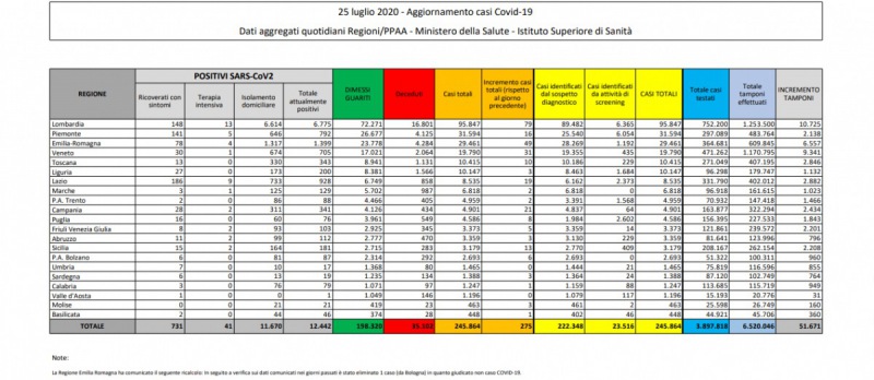 Coronavirus. Dati nazionali 25/07. In Campania sono 341 i positivi attuali