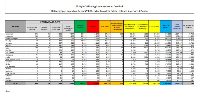 Questi i dati del Ministero della Salute: