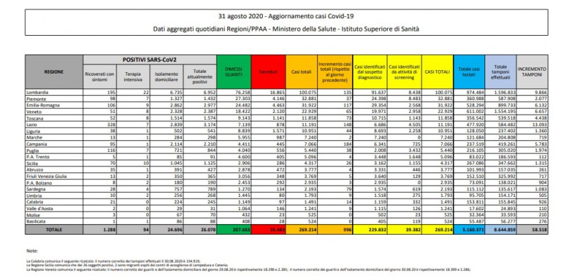 Coronavirus. Dati nazionali 31/08. In Campania sono 2.210 i positivi attuali