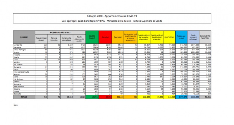 Questi i dati del Ministero della Salute: