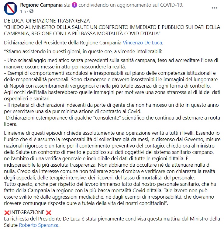 Questo quanto pubblicato sulla pagina facebook del Pres. De Luca: