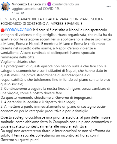 Dalla pagina Facebook del Governatore della Campania Vincenzo De Luca