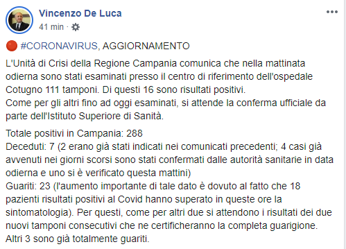 Lo apprendiamo dalla pagina Facebook del Governatore della Regione Campania: