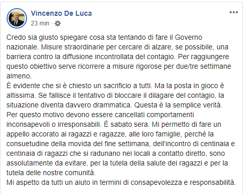 "Credo sia giusto spiegare cosa sta tentando di fare il Governo nazionale. Misure straordinarie per cercare di alzare, se possibile, una barriera contro la diffusione incontrollata del contagio. Per raggiungere questo obiettivo serve ricorrere a misure rigorose per due/tre settimane almeno. È evidente che si è chiesto un sacrificio a tutti. Ma la posta in gioco è altissima. Se fallisce il tentativo di bloccare il dilagare del contagio, la situazione diventa davvero drammatica. Questa è la semplice verità. Per questo motivo devono essere cancellati comportamenti inconsapevoli o irresponsabili. È sabato sera. Mi permetto di fare un appello accorato ai ragazzi e ragazze, alle loro famiglie, perché la consuetudine della movida del fine settimana, dell'incontro di centinaia e centinaia di ragazzi che si radunano nei locali a contatto diretto, sono assolutamente da evitare, per la tutela della salute dei ragazzi e per la tutela delle nostre comunità. Mi aspetto da tutti un aiuto in termini di consapevolezza e responsabilità."