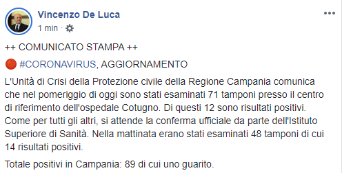 L'Unità di Crisi della Protezione civile della Regione Campania comunica che nel pomeriggio di oggi sono stati esaminati 71 tamponi presso il centro di riferimento dell'ospedale Cotugno. Di questi 12 sono risultati positivi. Come per tutti gli altri, si attende la conferma ufficiale da parte dell'Istituto Superiore di Sanità. Nella mattinata erano stati esaminati 48 tamponi di cui 14 risultati positivi. Totale positivi in Campania: 89 di cui uno guarito."