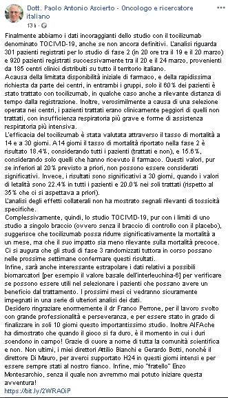 "Finalmente abbiamo i dati incoraggianti dello studio con il tocilizumab denominato TOCIVID-19, anche se non ancora definitivi. L’analisi riguarda 301 pazienti registrati per lo studio di fase 2 (in 20 ore tra il 19 e il 20 marzo) e 920 pazienti registrati successivamente tra il 20 e il 24 marzo, provenienti da 185 centri clinici distribuiti su tutto il territorio italiano. A causa della limitata disponibilità iniziale di farmaco, e della rapidissima richiesta da parte dei centri, in entrambi i gruppi, solo il 60% dei pazienti è stato trattato con tocilizumab, in qualche caso anche a rilevante distanza di tempo dalla registrazione. Inoltre, verosimilmente a causa di una selezione operata nei centri, i pazienti trattati erano clinicamente peggiori di quelli non trattati, con insufficienza respiratoria più grave e forme di assistenza respiratoria più intensiva. L‘efficacia del tocilizumab è stata valutata attraverso il tasso di mortalità a 14 e a 30 giorni. A 14 giorni il tasso di mortalità riportato nella fase 2 è risultato 18.4%, considerando tutti i pazienti (trattati e non), e 15.6%, considerando solo quelli che hanno ricevuto il farmaco. Questi valori, pur se inferiori al 20% previsto a priori, non possono essere considerati significativi. Invece, i risultati sono significativi a 30 giorni, quando i valori di letalità sono 22.4% in tutti i pazienti e 20.0% nei soli trattati (rispetto al 35% che ci si aspettava a priori). L’analisi degli effetti collaterali non ha mostrato segnali rilevanti di tossicità specifiche. Complessivamente, quindi, lo studio TOCIVID-19, pur con i limiti di uno studio a singolo braccio (ovvero senza il braccio di controllo con il placebo), suggerisce che tocilizumab possa ridurre significativamente la mortalità a un mese, ma che il suo impatto sia meno rilevante sulla mortalità precoce. Ci si augura che gli studi di fase 3 randomizzati tuttora in corso possano nelle prossime settimane confermare questi risultati. Infine, sarà anche interessante estrapolare i dati relativi a possibili biomarcatori [per esempio il valore basale dell’interleuchina-6] per verificare se possono essere utili nel selezionare i pazienti che possano avere un beneficio dal trattamento. I prossimi mesi ci vedranno sicuramente impegnati in una serie di ulteriori analisi dei dati. Desidero ringraziare enormemente il dr Franco Perrone, per il lavoro svolto con grande professionalità e perseveranza, e per essere stato in grado di finalizzare in soli 10 giorni questo importantissimo studio. Inoltre AIFA che ha dimostrato che quando il gioco si fa duro, è il momento in cui i duri scendono in campo! Grazie di cuore a nome di tutta la comunità scientifica e non. Non ultimi, i miei direttori Attilio Bianchi e Gerardo Botti, nonché il direttore Di Mauro, per averci supportato H24 in questi giorni intensi e per essere sempre stati al nostro fianco. Infine, mio “fratello” Enzo Montesarchio, senza il quale non avremmo mai potuto iniziare questa avventura!"