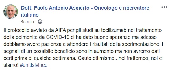 Questo quanto pubblicato sulla pagina facebook del dott. Ascierto: