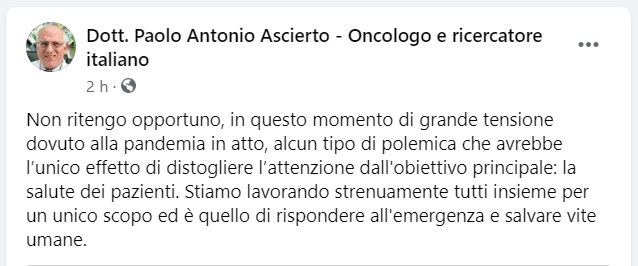 Questo quanto comunicato dal Dottor Paolo Antonio Ascierto