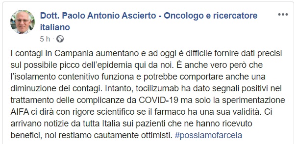 Coronavirus. Dott. Ascierto: "Tocilizumab, ci arrivano notizie da tutta Italia sui pazienti che ne hanno avuto benefici"