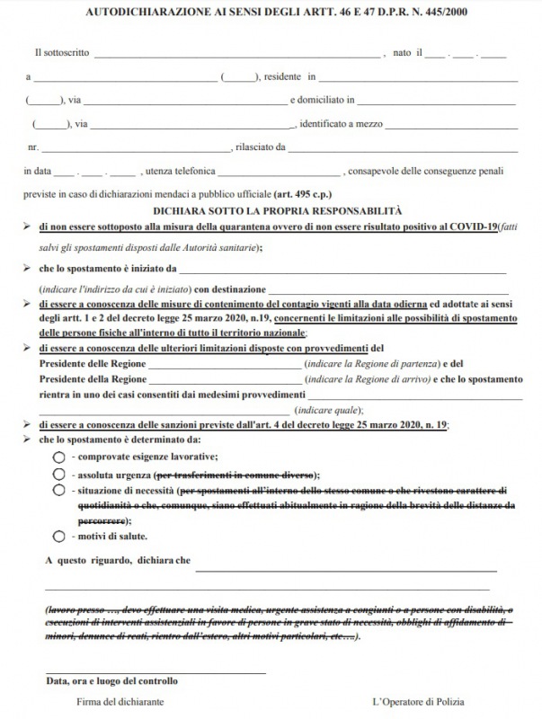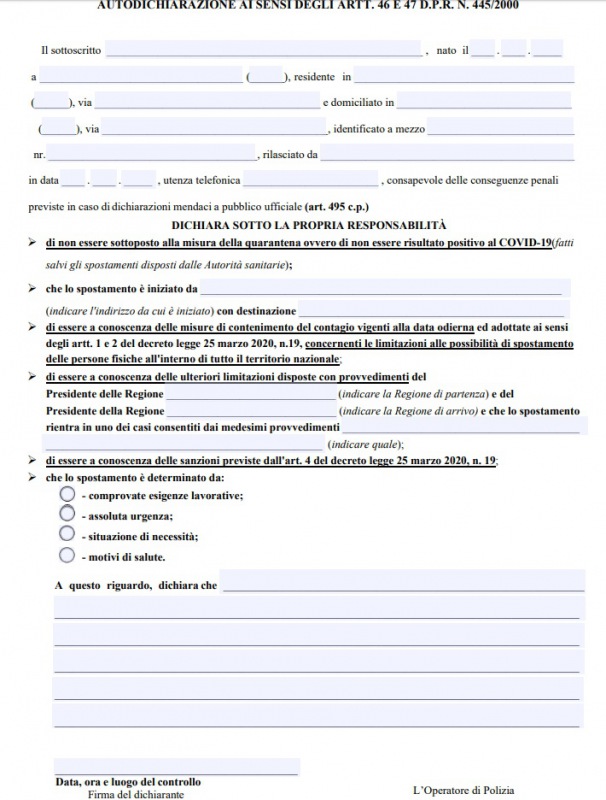 È disponibile il modello di autodichiarazione per gli spostamenti dal 4 maggio 2020. Può essere ancora utilizzato il precedente modello barrando le voci non più attuali. L'autodichiarazione è in possesso degli operatori di polizia e può essere compilata al momento del controllo."